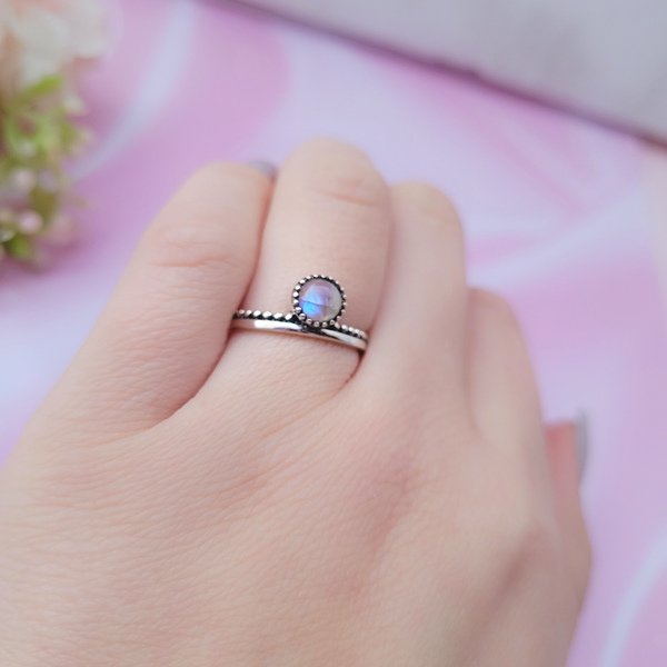 Anillo con piedra luna natural. Al moverlo podrás apreciar un brillo azul inigualable de la piedra luna.