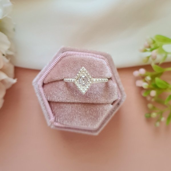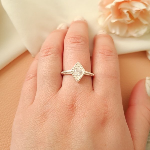 – Anillo solitario en forma de rombo con circón blanco