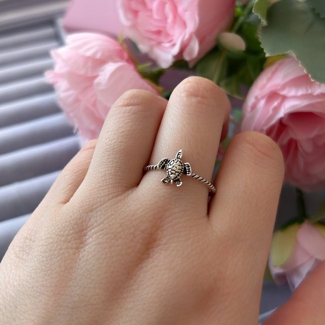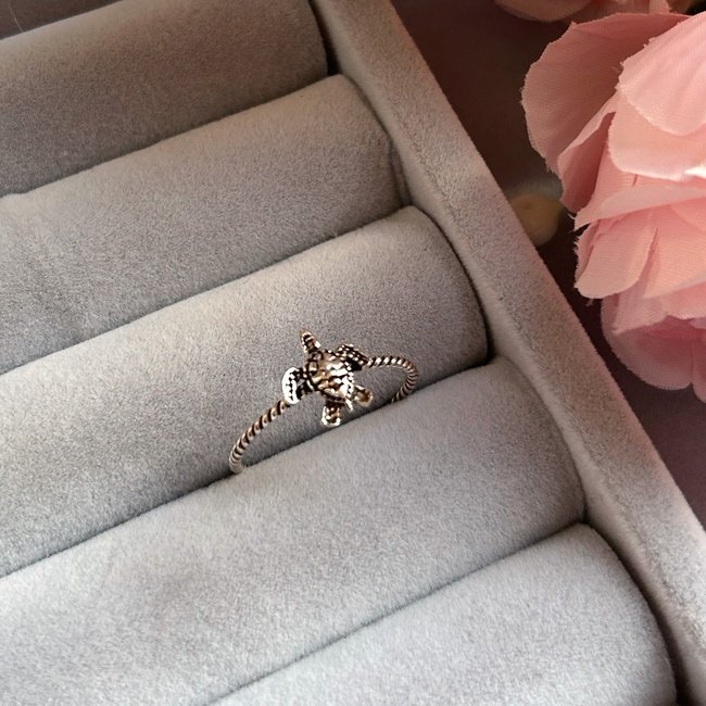 – Anillo con diseño de cuerda y una tortuga con toque envejecido
