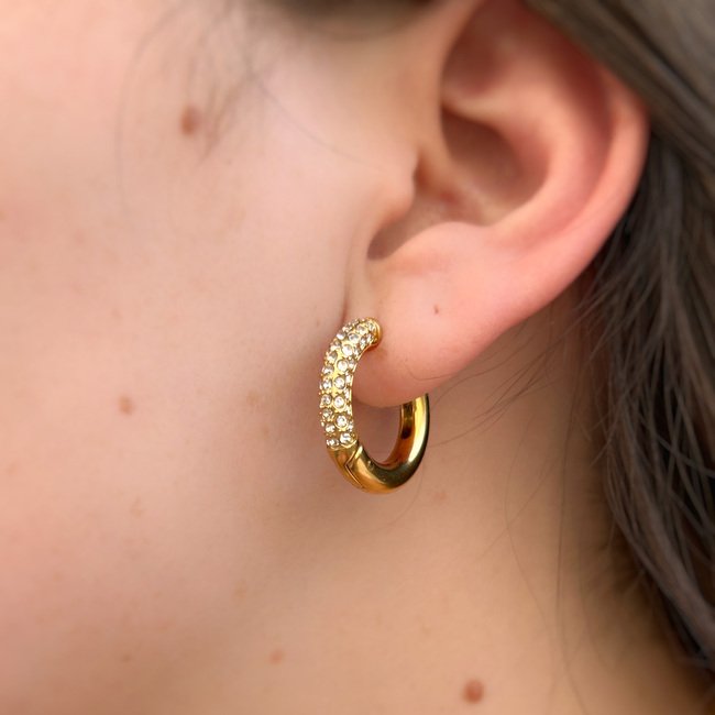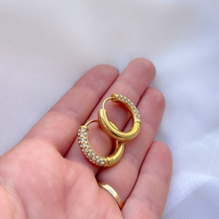 – Argollas tipo huggies reversibles (un lado dorado liso y otro dorado con circones brillantes)
