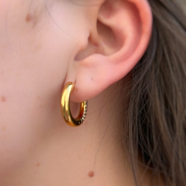 Unas argollas con todo el estilo único del diseño huggies, que te permitirán brillar aún más por sus circones que reflejan la luz, o simplemente darte un toque formal y elegante, al poder elegir el lado de la argolla al que quieres darle protagonismo.