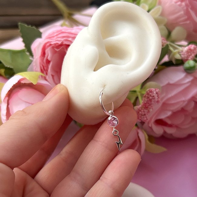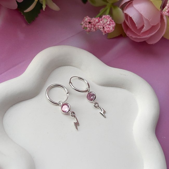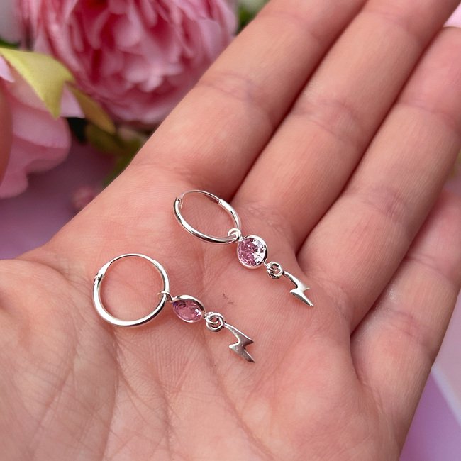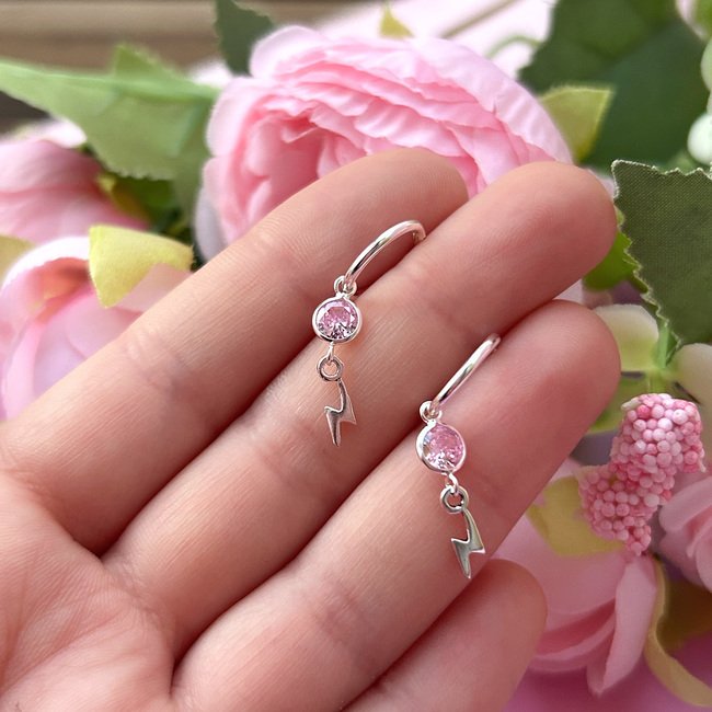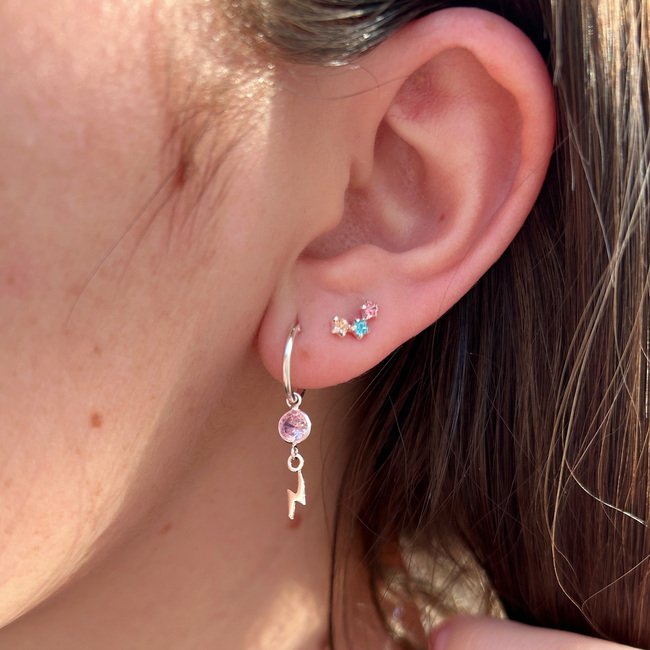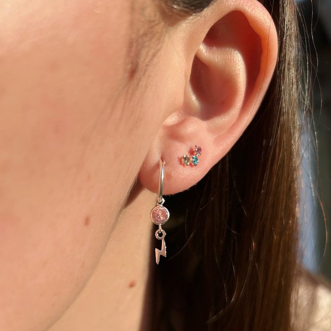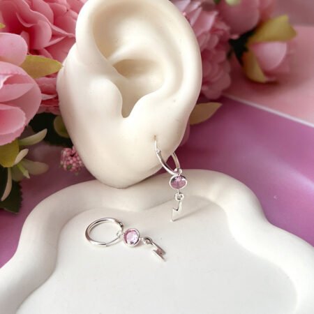 – Argollas con colgante de rayo y un circón rosado.