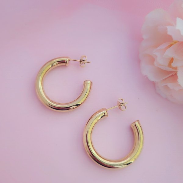 Estas argollas son un básico en tu joyero!! Son sencillas pero a la ves llamativas por su brillo y grosor… No te preocupes por su peso, son ultra livianas, así que no dañaran tus orejitas