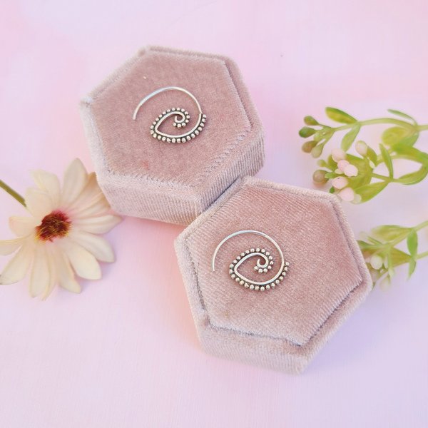 Estos aros con diseño tribal en forma de espiral combinan fuerza simbólica y estilo atemporal. La espiral, presente en muchas culturas ancestrales, representa el crecimiento, la conexión con la naturaleza y el fluir constante de la vida.