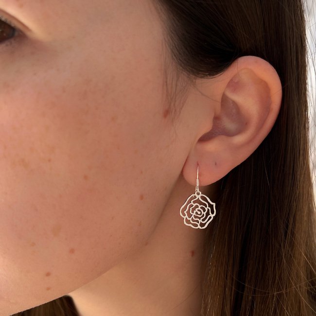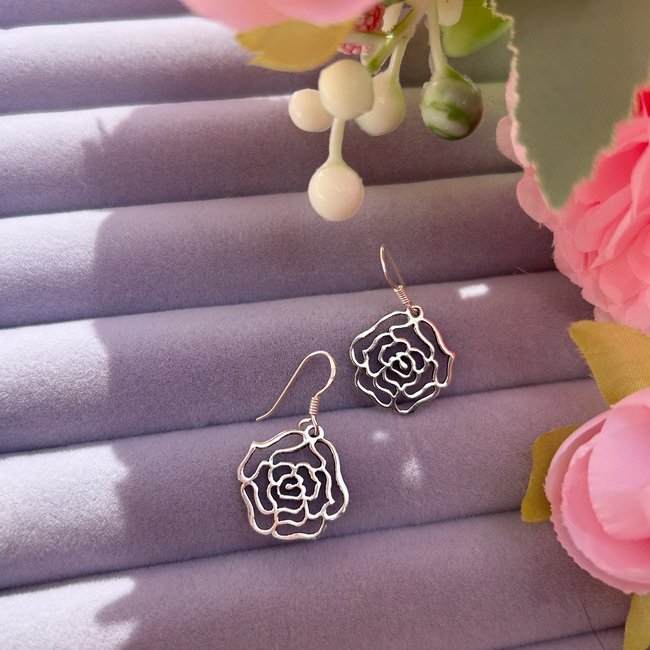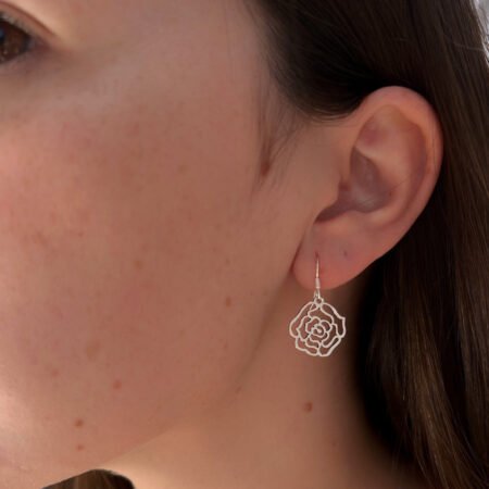 Estos elegantes aros colgantes con forma de rosa capturan la esencia de una flor que simboliza amor, feminidad y renovación. Su diseño liso y estilizado aporta un aire sofisticado y moderno, ideal para quienes buscan un toque floral sin perder la simplicidad y el buen gusto.