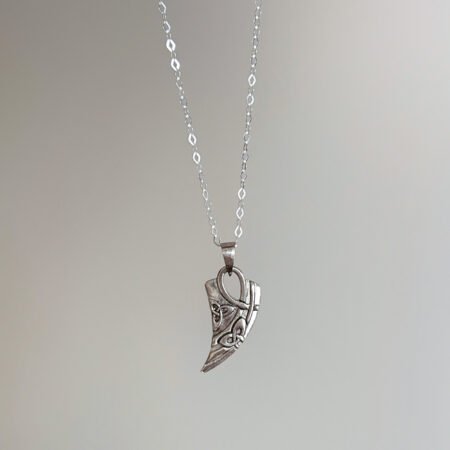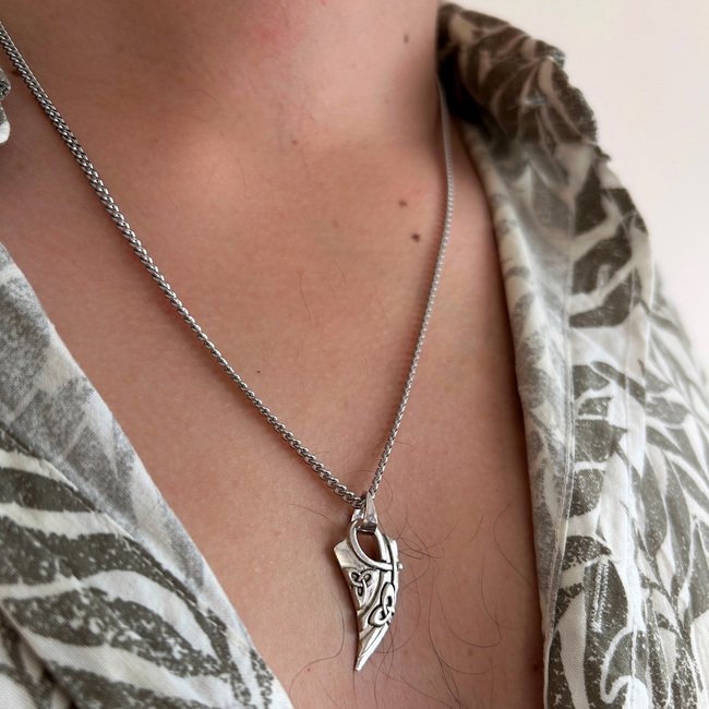 Este colgante en forma de colmillo combina la energía salvaje y protectora de la naturaleza con el poder simbólico de la triqueta celta, grabada en su interior. La triqueta representa la unión de cuerpo, mente y espíritu, y ha sido usada durante siglos como amuleto de protección y equilibrio.