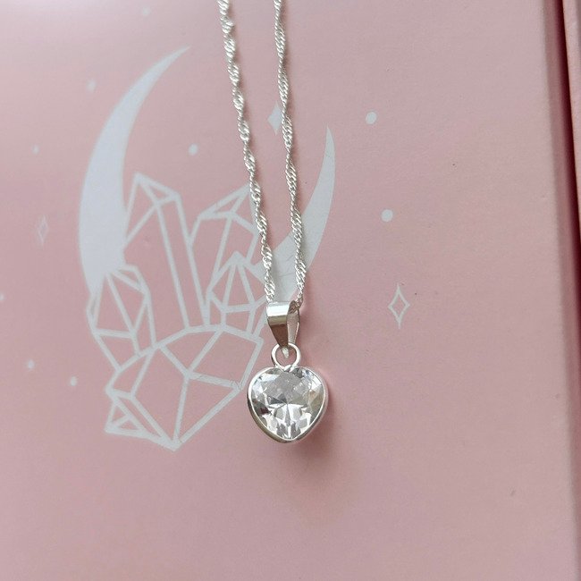 Un colgante sutil y atemporal que ilumina con elegancia. Su diseño tipo punto de luz en forma de corazón con cristal transparente refleja la luz de manera delicada, simbolizando el amor puro y la sencillez en su máxima expresión.