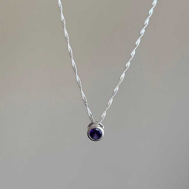 Un diseño minimalista y moderno que destaca por su delicadeza. Este colgante tipo punto de luz en forma circular con cristal morado no posee valier, permitiendo que la cadena pase directamente a través del colgante, creando un efecto limpio y sofisticado.