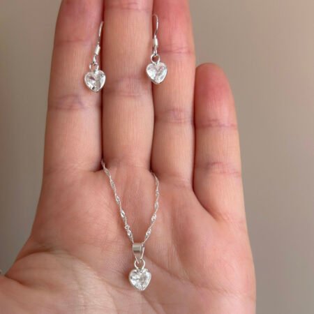 Un conjunto que refleja pureza, luz y amor en su forma más simple. El colgante y el par de aros presentan un delicado circón en forma de corazón color cristal transparente, que brilla sutilmente y realza cualquier look con elegancia.