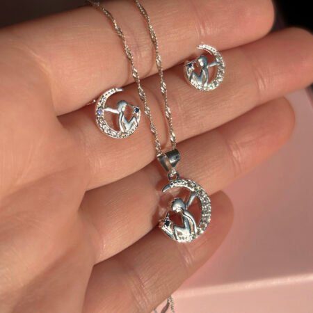 Un conjunto inspirado en la magia de El Principito, que invita a recordar que “lo esencial es invisible a los ojos”. El colgante y el par de aros presentan el delicado diseño del Principito sentado sobre la luna, la cual brilla suavemente gracias a sus circones, evocando sueños, amor y nostalgia.