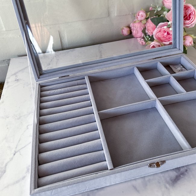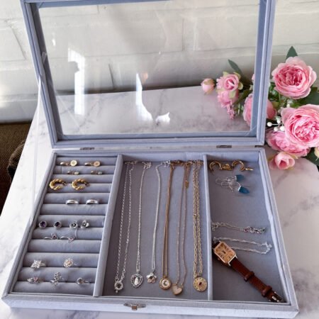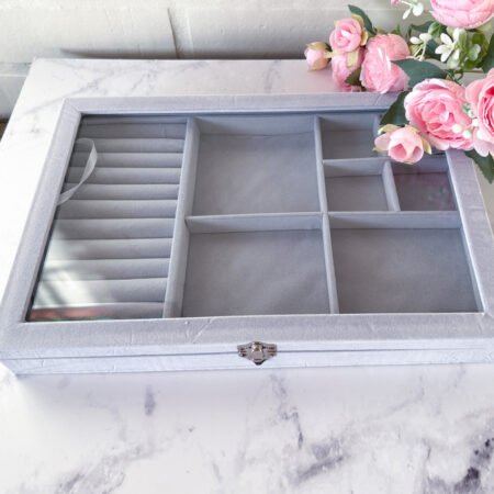 Mantén tus joyas ordenadas y siempre a la vista con este joyero XL. Su tapa de vidrio no solo las protege del polvo y la suciedad, sino que también te permite admirar su interior, asegurándote de que ninguna pieza especial quede olvidada.