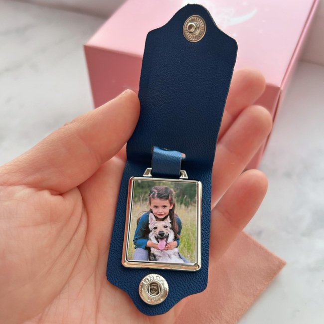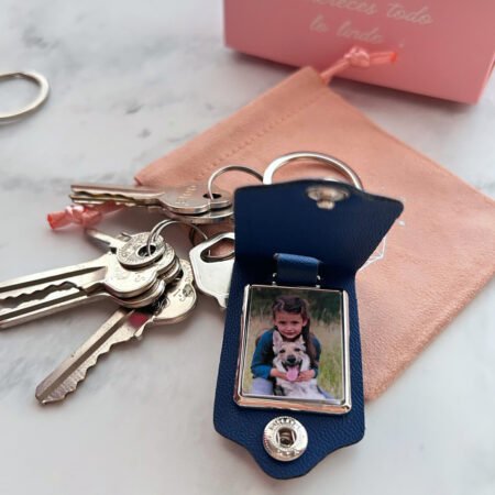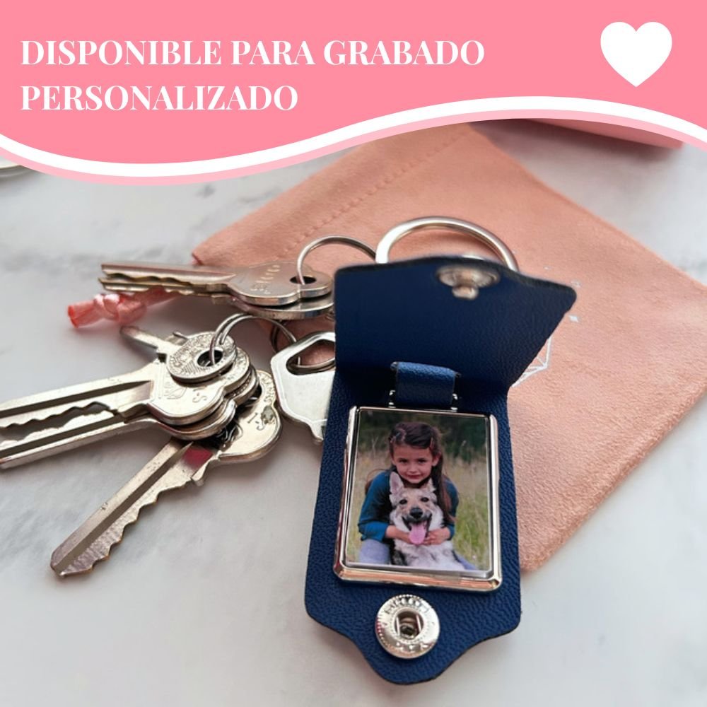 Lleva tus recuerdos siempre contigo con este elegante llavero de eco cuero, que incorpora una medalla rectangular donde puedes personalizar la foto que más atesores: un ser querido, una mascota, una fecha especial… tú eliges.