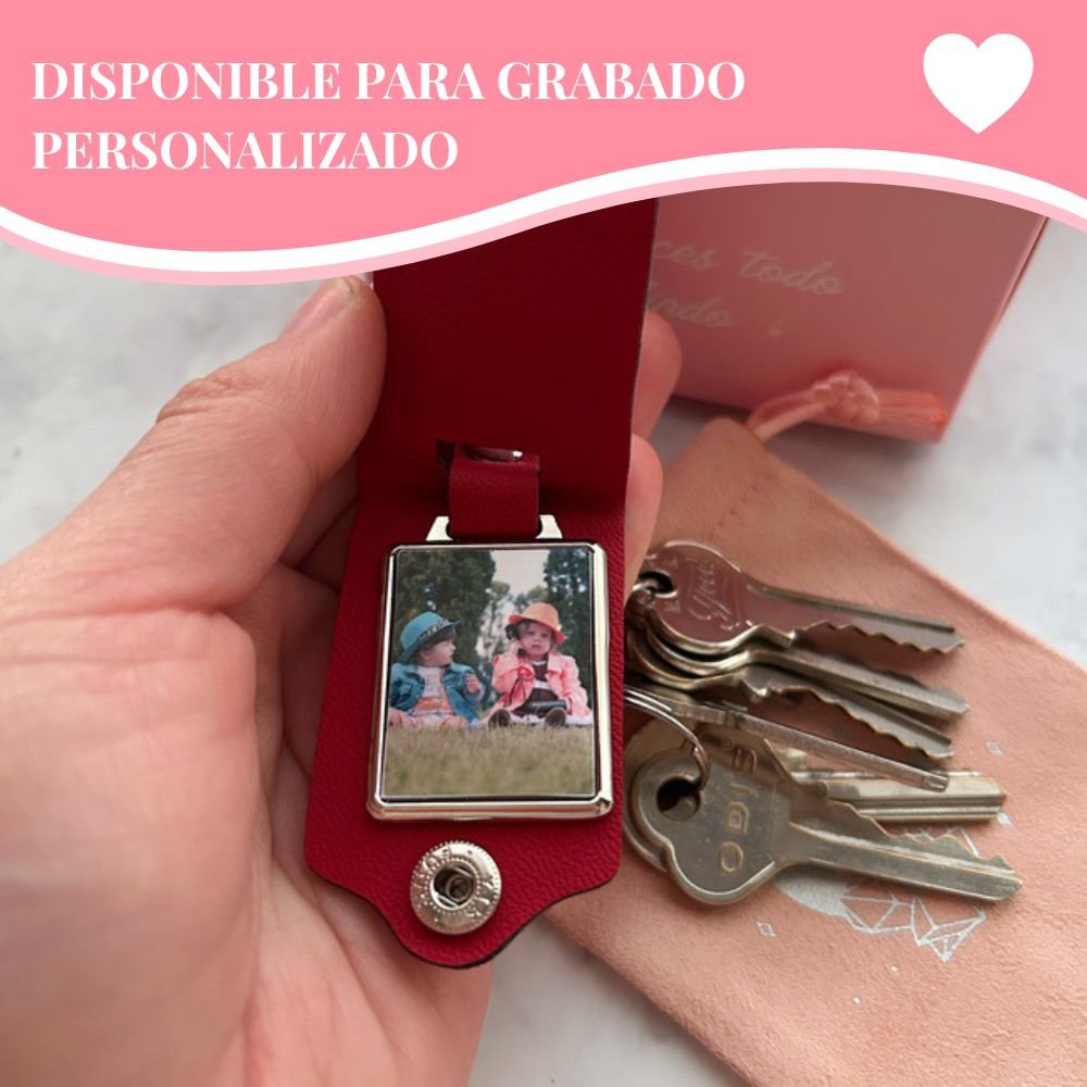 Lleva tus recuerdos siempre contigo con este elegante llavero de eco cuero, que incorpora una medalla rectangular donde puedes personalizar la foto que más atesores: un ser querido, una mascota, una fecha especial… tú eliges.