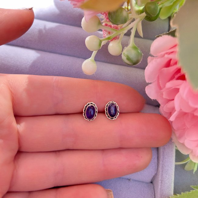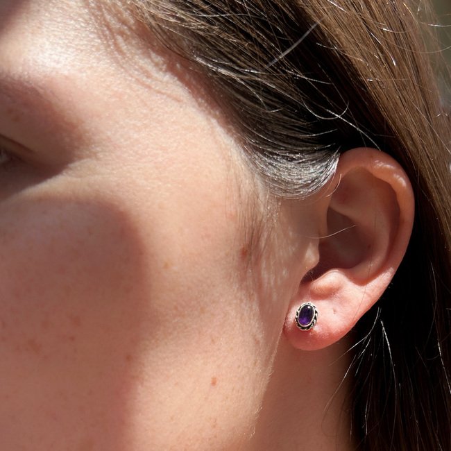 Estos aros apegados destacan por su forma ovalada y la presencia de una piedra amatista natural en el centro, conocida por su tono violeta profundo y su energía calmante. Cada par es una pequeña joya de equilibrio y elegancia, ideal para quienes buscan un accesorio con significado y estilo.