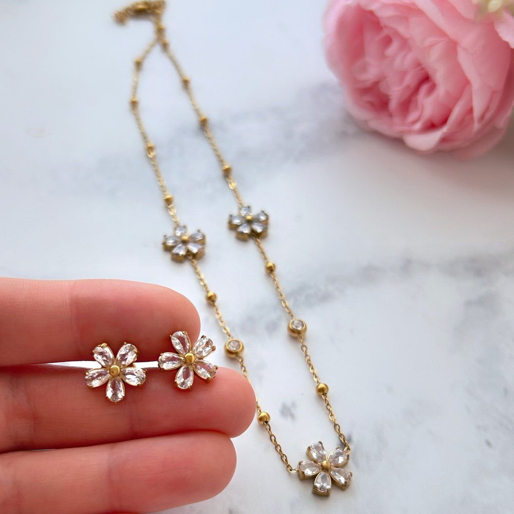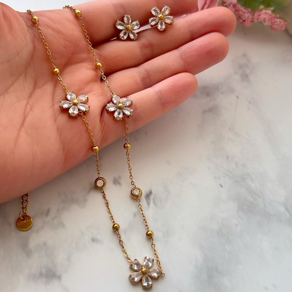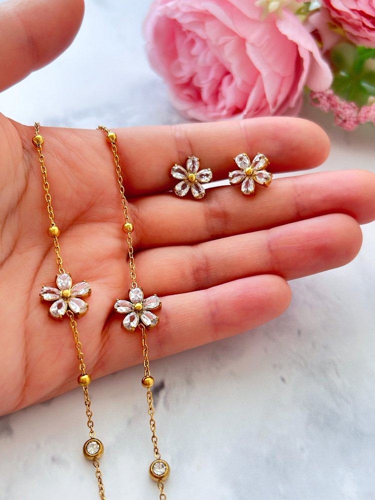 1 valoración en Conjunto Flor Radiante – Acero Inoxidable Enchape de oro 18K