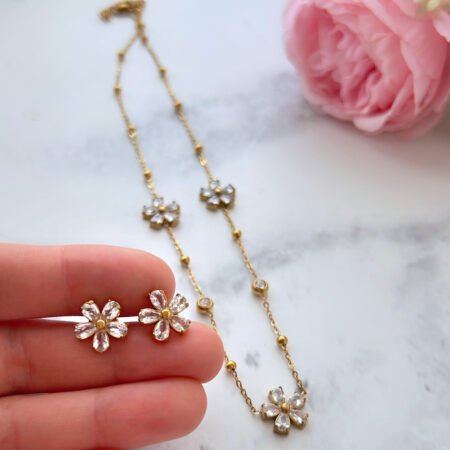 Un conjunto que combina delicadeza y luz en cada detalle. Está compuesto por un collar con diseño de flores acompañadas de circunferencias nacaradas, que aportan un brillo suave y elegante, junto a un par de aros a juego con la misma flor nacarada.