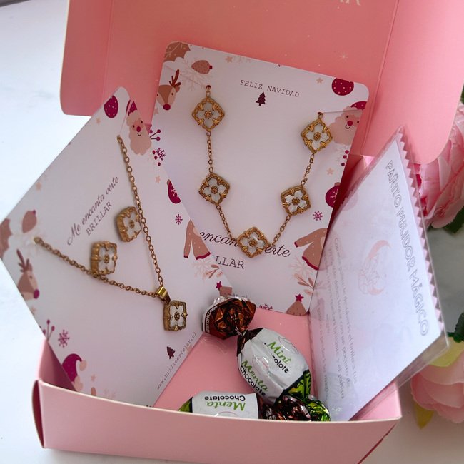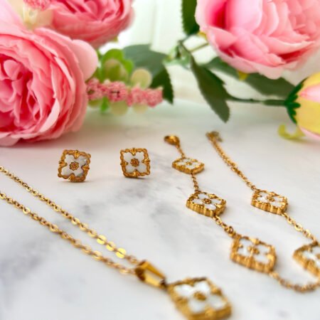 El trébol, símbolo de buena fortuna y armonía, se realza con el brillo suave del acabado perlado y el enchapado en oro de 18K. Fabricado en acero inoxidable, este conjunto ofrece durabilidad y resistencia, ideal para el uso diario sin perder elegancia.