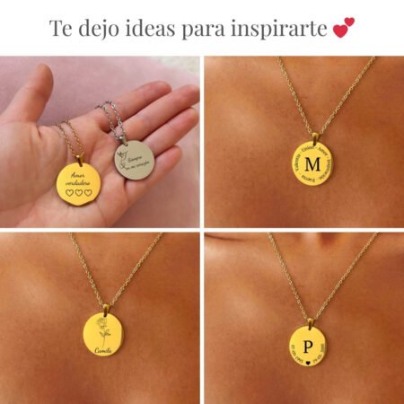 El protagonista es un collar de placa redonda de acero inoxidable waterproof, completamente personalizable en ambas caras: